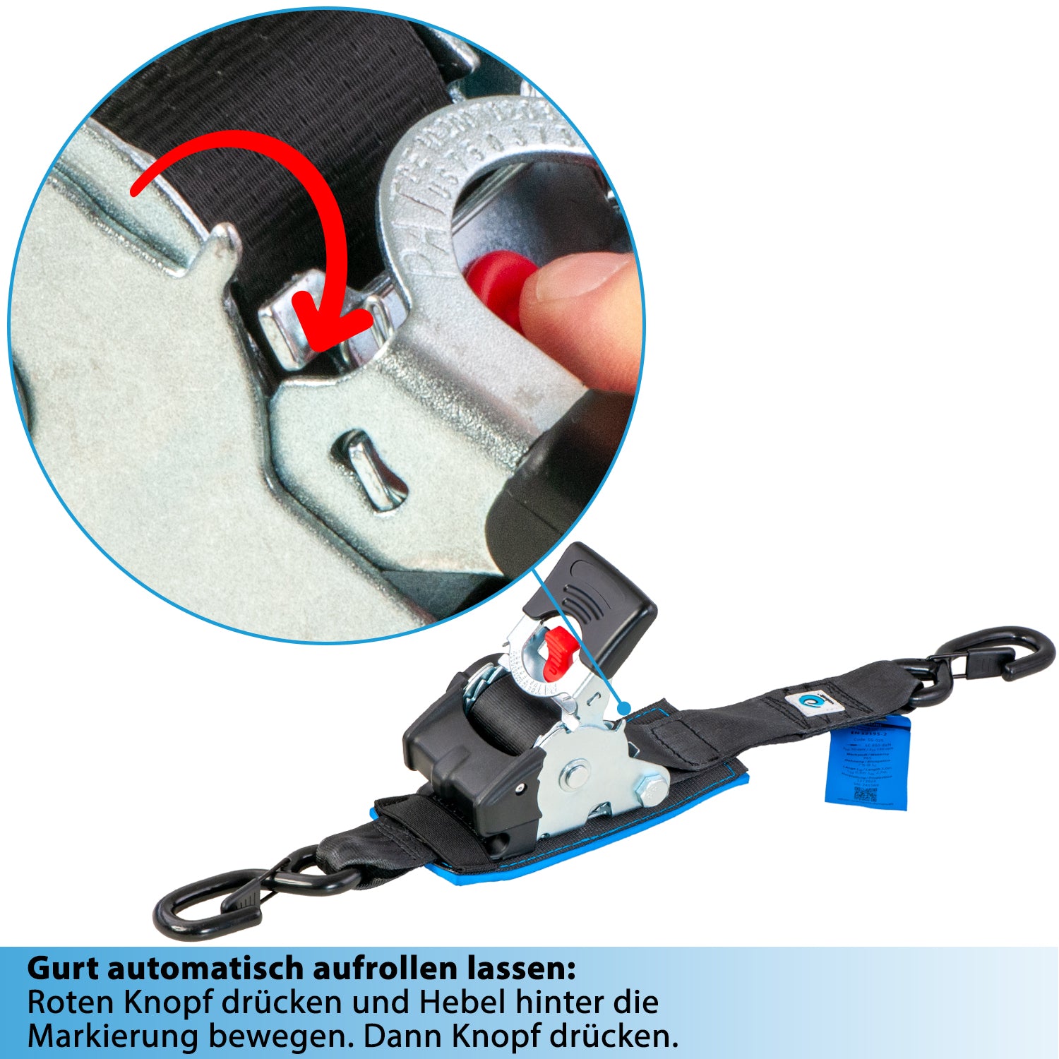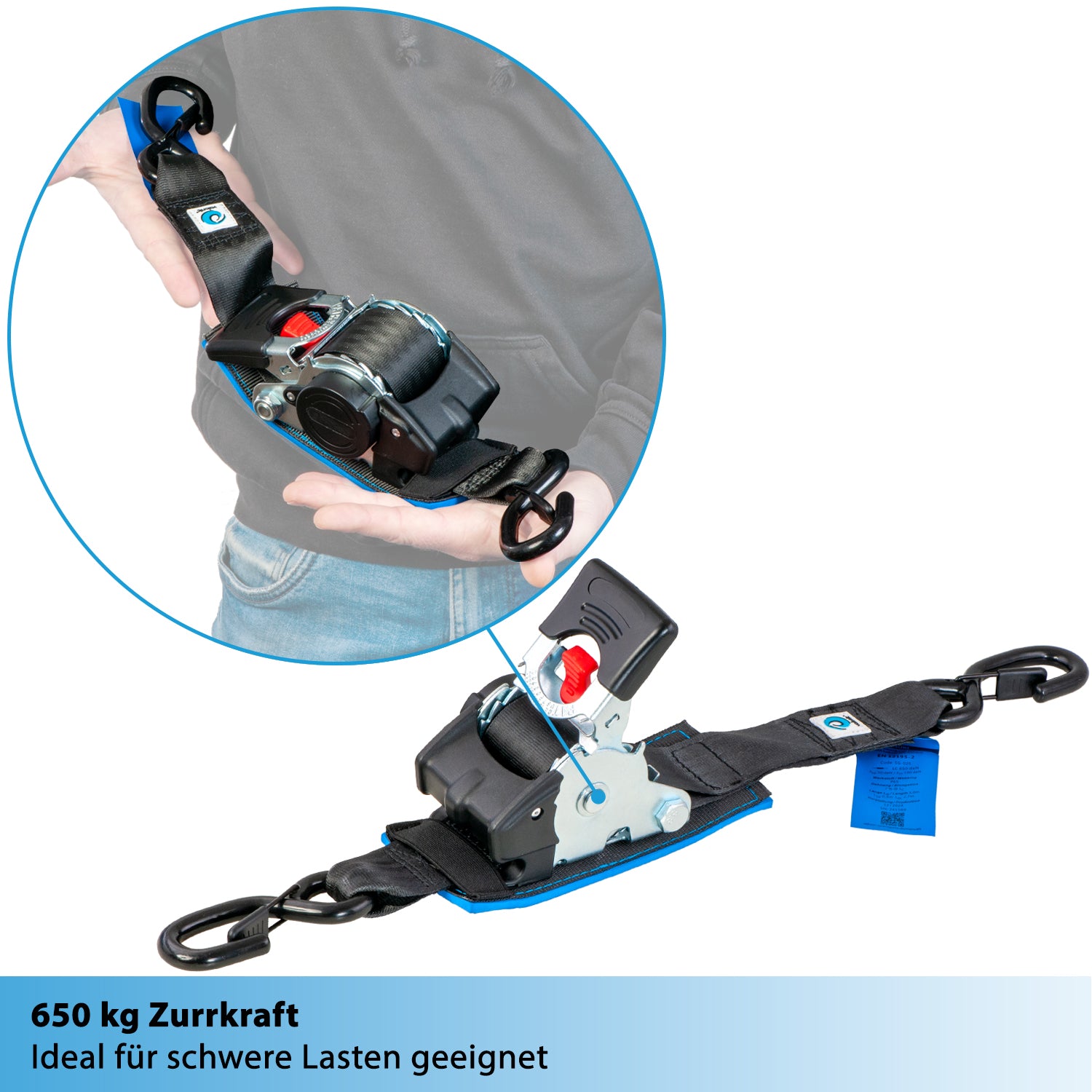 Unsere Automatik-Spanngurte sind nicht nur vielseitig, sondern auch perfekt für z.B. Motorradtransporte geeignet. Das strapazierfähige Gurtband besteht aus hochwertigem Polyester, während die Ratsche aus verzinktem Stahl gefertigt ist. Die Zurrkraft liegt bei 650 daN bzw. 650kg im geraden Zug.