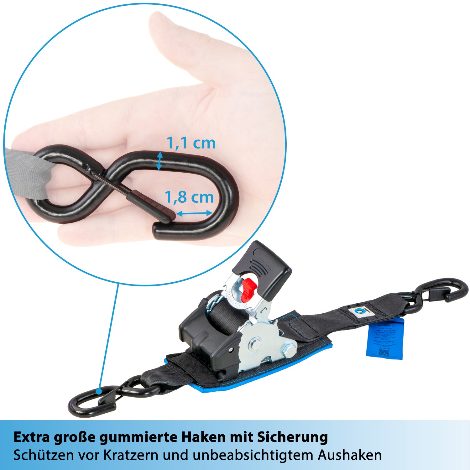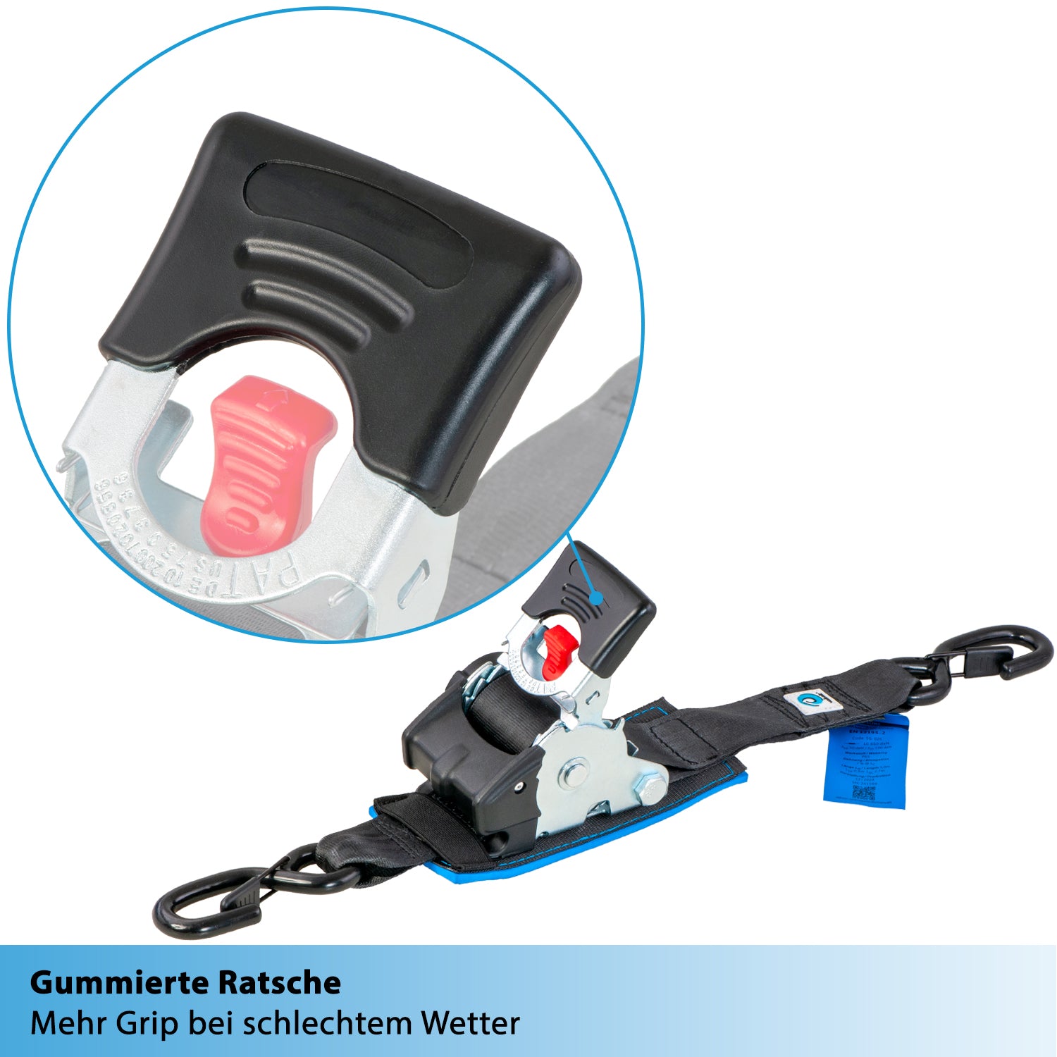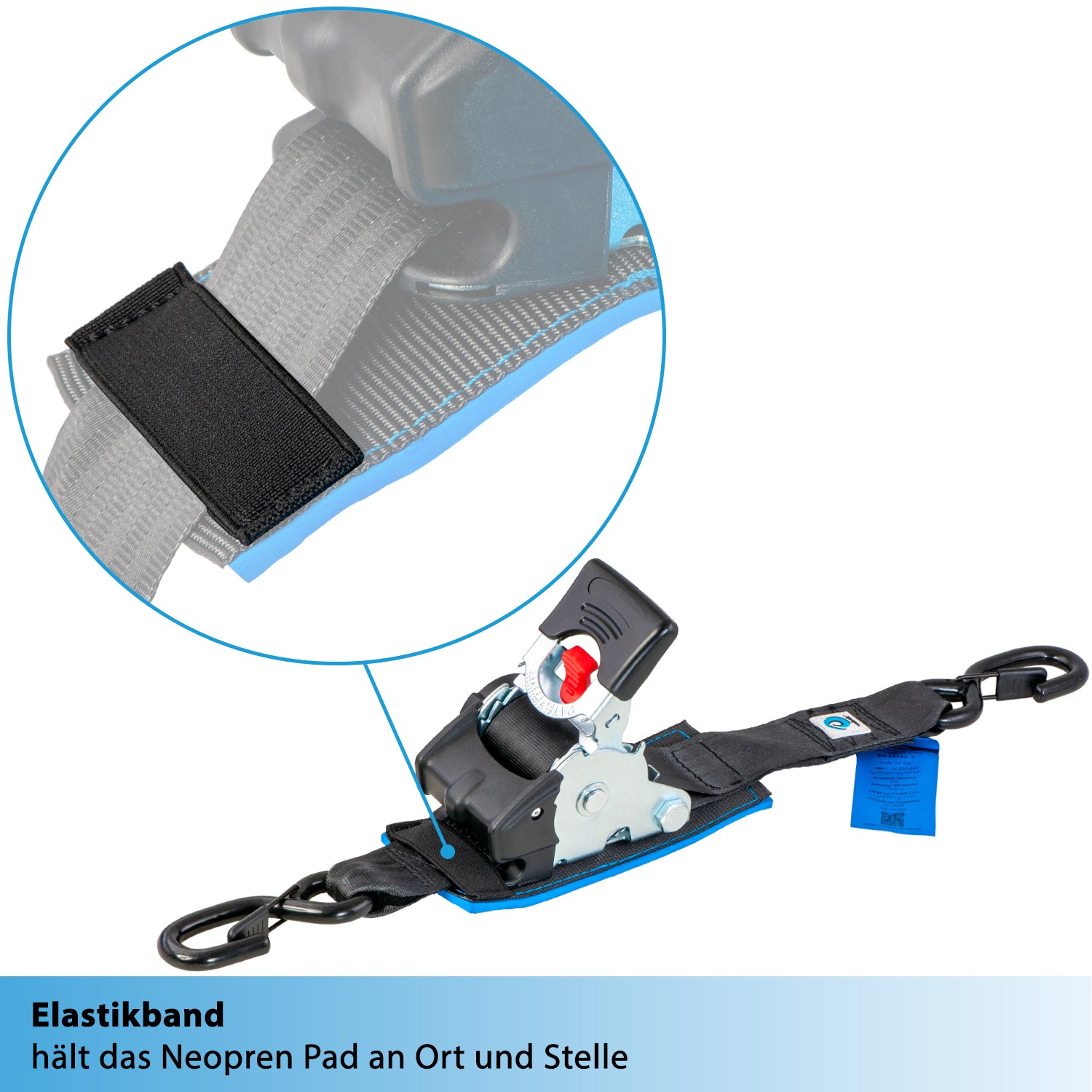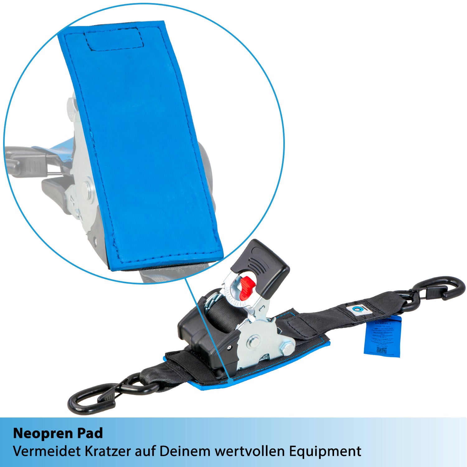 Durch ein mit einem Neoprenpad unterlegtes und mit Kunststoff teilummanteltes Ratschenschloss schützt der Zurrgurt z.B. Dein Fahrrad beim Verzurren auf dem Fahrradträger vor ärgerlichen Kratzern. -